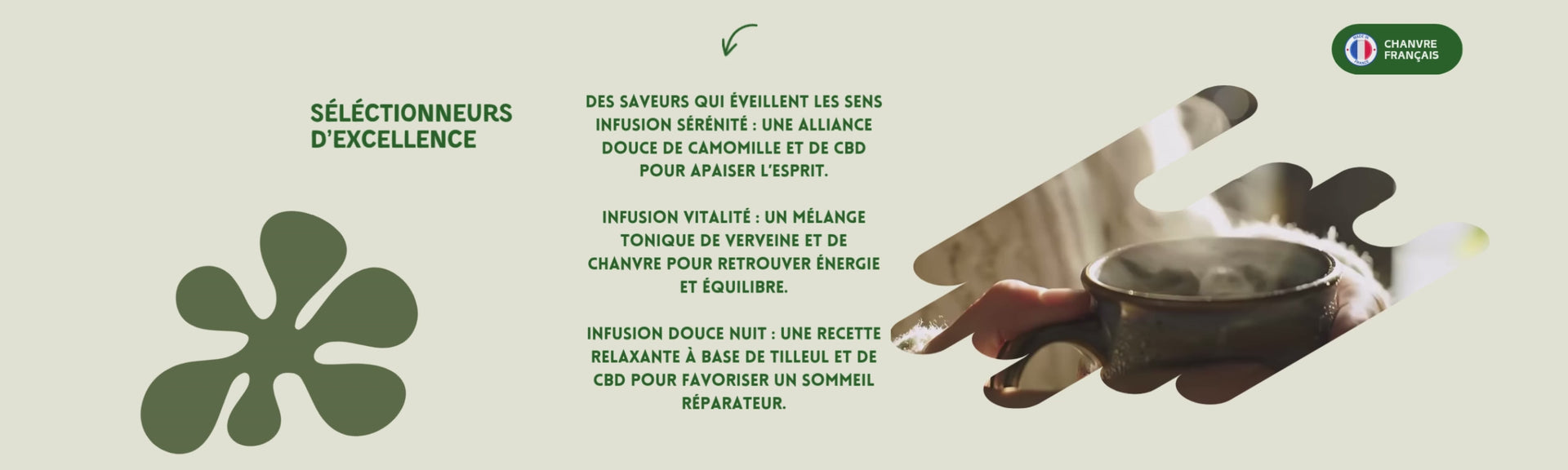 De l'énergie douce pour vos matins, de la sérénité profonde pour vos nuits. Nos infusions CBD artisanales vous accompagnent du réveil au coucher, avec équilibre et bien-être naturel.